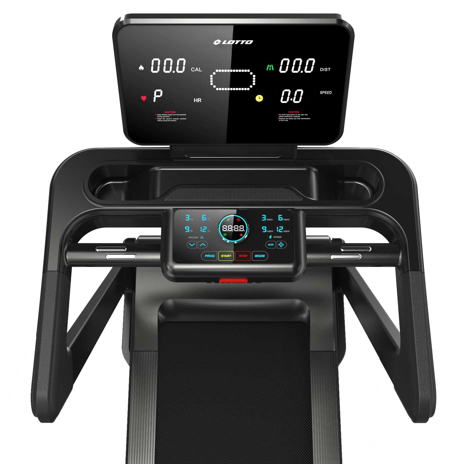 Consola LED cu lumină albă și 4 ferestre afișează clar toți parametrii esențiali ai antrenamentului – viteză, timp, distanță, calorii, puls și înclinare. Banda dispune de 12 programe presetate, precum și de taste rapide pentru viteză (3/6/9/12 km/h) și înclinare (3/6/9/12 nivele), pentru ajustări rapide și intuitive în timpul exercițiilor. Senzorii de puls manuali permit monitorizarea ritmului cardiac, iar boxele Bluetooth integrate oferă un plus de confort și divertisment.